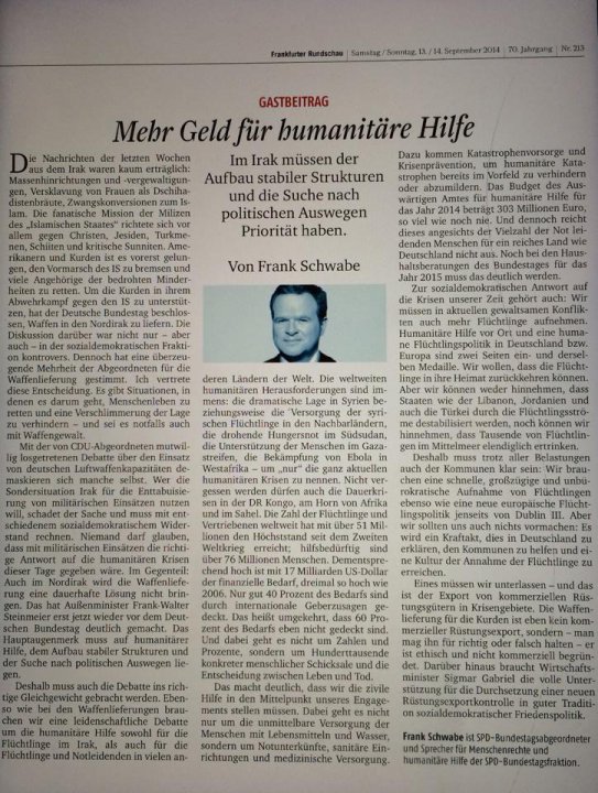 In einem Gastbeitrag in der Wochenendausgabe der Frankfurter Rundschau, erläutert Frank Schwabe, weshalb mehr Geld für humanitäre Hilfe nötig ist und der Aufbau stabiler Strukturen und die Suche nach politischen Auswegen im Irak Priorität haben sollten. Hier können Sie den Artikel von Frank Schwabe lesen.