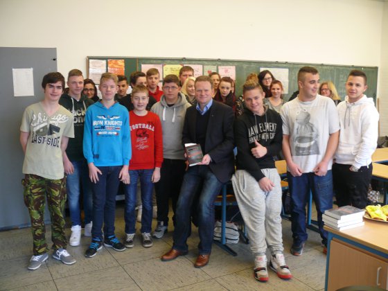 Dort las er Schülerinnen und Schülern der 9. Klasse aus dem Buch „Weggesperrt“ von Grit Poppe vor. Das Buch wählte er aus, weil sich die Klasse im Vorfeld mit dem Thema „DDR“ beschäftigte. Schwabe: „Ich habe die Gelegenheit genutzt, um auch mit den Schülern über das Thema ‚Menschenrechte‘ ins Gespräch zu kommen. Beeindruckt zeigten sich die Jugendlichen davon, dass noch heute in vielen Teilen der Welt Menschen unterdrückt und entrechtet werden.“ Eine Woche zuvor war die Schulklasse auf Einladung von Frank Schwabe in Berlin und besuchte dort u.a. auch das ehemalige Untersuchungsgefängnis der DDR-Staatssicherheit in Hohenschönhausen.