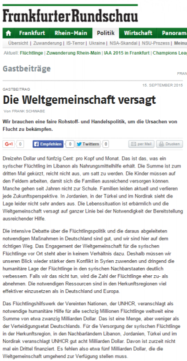 "Dreizehn Dollar und fünfzig Cent. Pro Kopf und Monat. Das ist das was ein syrischer Flüchtling im Libanon als Nahrungsmittelhilfe erhält. Die Summe ist zum dritten Mal gekürzt, reicht nicht aus um satt zu werden. Die Kinder müssen auf den Feldern arbeiten, damit sich die Familien ausreichend versorgen können. Manche gehen seit Jahren nicht zur Schule. Familien leiden aktuell und verlieren jede Zukunftsperspektive. In Jordanien, in der Türkei und im Nordirak sieht die Lage leider nicht sehr anders aus. Die Lebenssituation ist erbärmlich und die Welt versagt bei der Notwendigkeit der Bereitstellung ausreichender Hilfe.