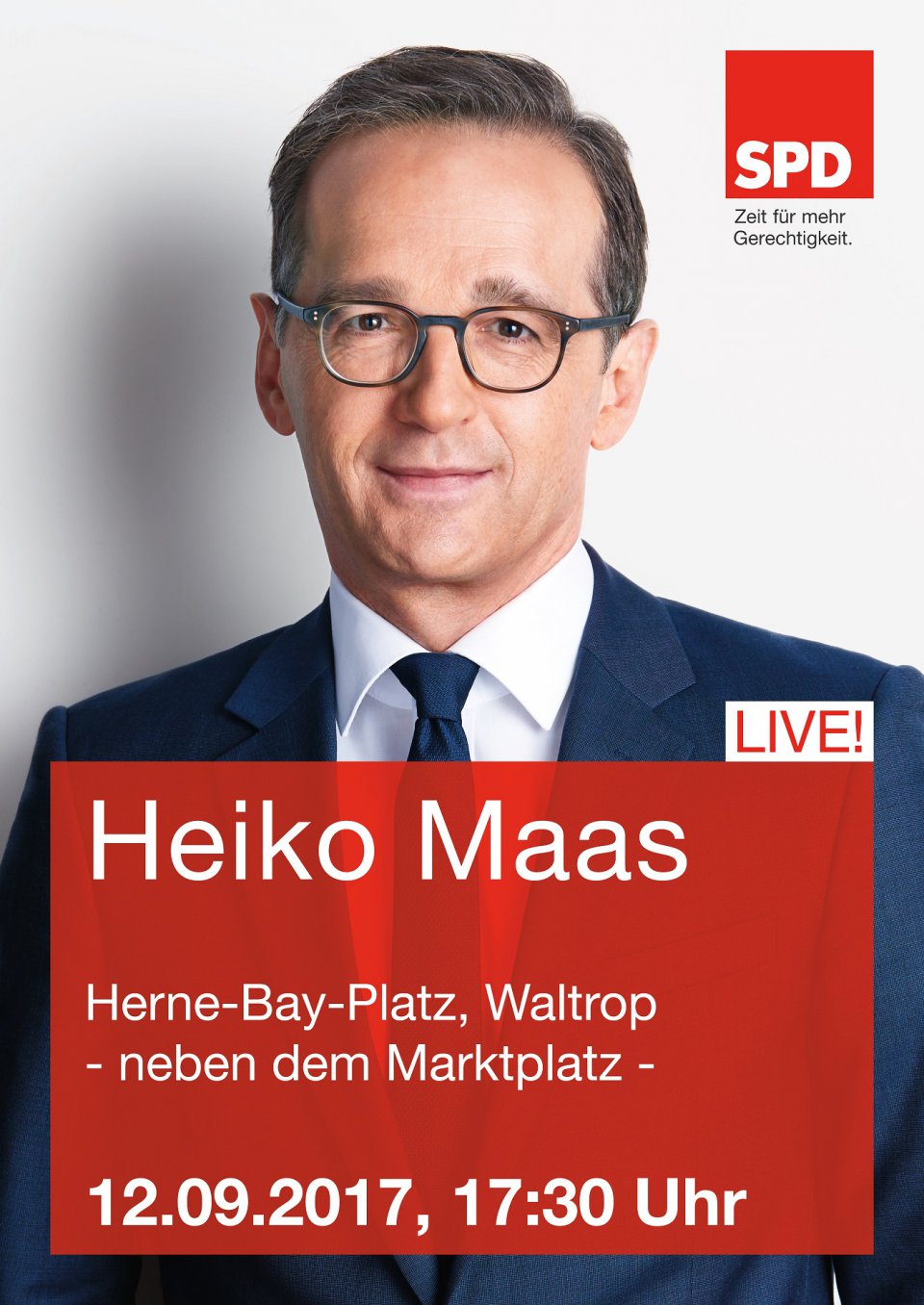 Nach Bundesaußenminister Sigmar Gabriel in Recklinghausen und dem SPD-Landesvorsitzenden Mike Groschek in Castrop-Rauxel wird nun auch Bundesjustizminister Heiko Maas in den Wahlkreis kommen, um den heimischen Bundestagsabgeordneten Frank Schwabe im Wahlkampf zu unterstützen. Am 12.9. wird Maas zu einer Kundgebung auf dem Herne-Bay-Platz in Waltrop erwartet.