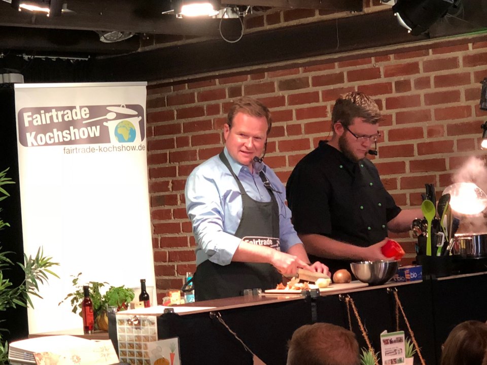 Neben den kulinarischen Köstlichkeiten gab es für die Gäste an dem Abend interessante Hintergrundberichte rund um den Fairen Handel und Fairtrade-Produzenten. Dafür reiste Hendrik Meisel vorab gemeinsam mit Klaus Hamelmann, ebenfalls Ideengeber für die Kochshow, durch verschiedene Länder in Asien, Afrika und Lateinamerika und besuchte einige Fairtrade-Produzenten. Und auch Frank Schwabe berichtete über seine Reisen nach Zentralamerika, wo er sich u.a. in Guatemala über verschiedene Projekte des Fairen Handels informierte.