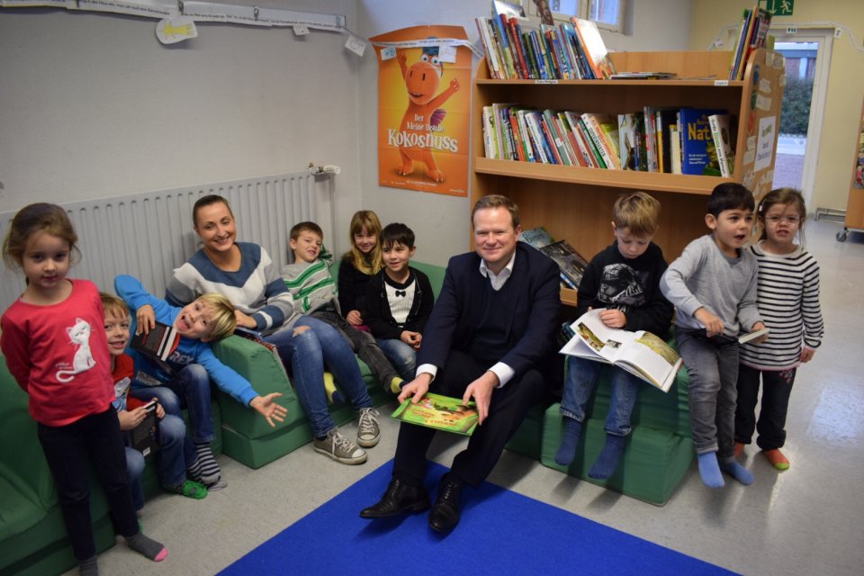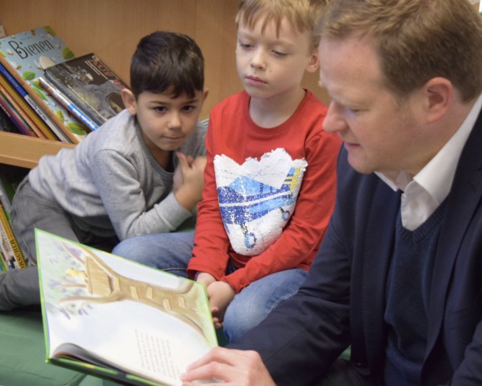 Gemeinsam mit Ratsfrau Elke Kant besuchte der heimische Bundestagsabgeordnete Frank Schwabe den Leseclub am Standort Anne-Frank-Schule der Grundschule Suderwich. Vor Ort informierten Schulleiter Peter Maaß und die ehrenamtlichen Betreuerinnen die Gäste über das Angebot. Für seinen Besuch brachte Frank Schwabe das Buch „Meins! Nein meins!“ von Norbert Landa mit und las den anwesenden Kindern des AWO Kindergartens „Im Paßkamp“ daraus vor.