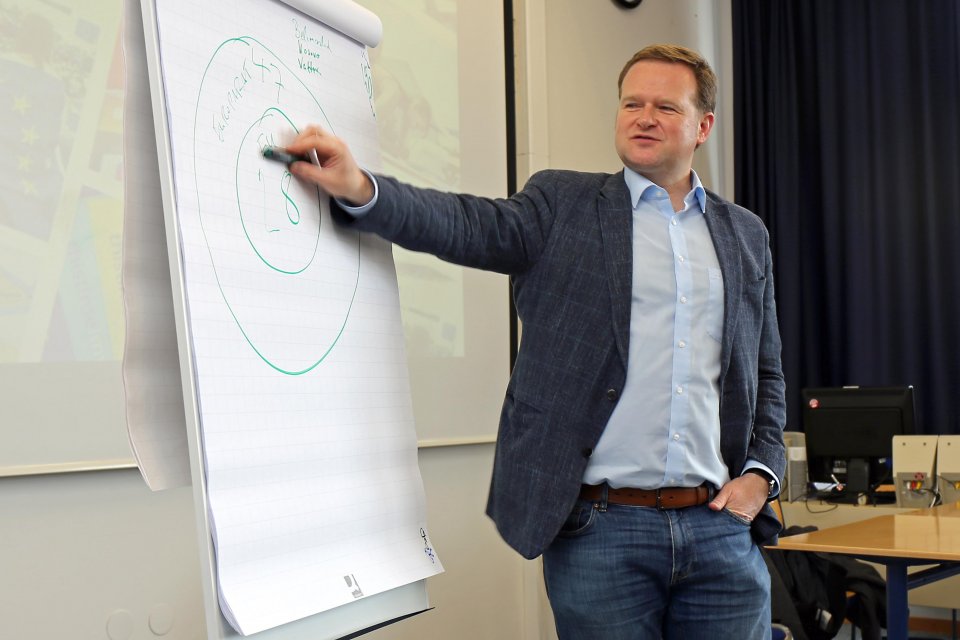 Um den Schülern zunächst einen Einblick in die Strukturen zu geben, erklärte Frank Schwabe ihnen den Unterschied zwischen der Europäischen Union und dem Europarat. Dabei beschrieb er seine Aufgaben als stellvertretender Leiter der Deutschen Delegation und als Vorsitzender der Fraktion der Sozialdemokratischen und Grünen Fraktion im Europarat.