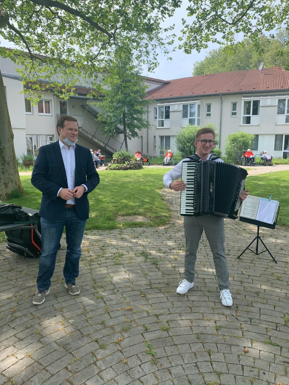 Neben Klassikern wie Bella Ciao, Rosamunde und dem Walzer Nr. 2 von Dmitri Schostakowitsch erfreute der Schüler die Anwesenden auch mit dem Steigerlied. Im Innenhof des Seniorenzentrums saßen in einem großen Kreis rund 50 Personen, weitere beobachteten von den Fenstern aus das Geschehen. Bohdanov spielte mit großem Sicherheitsabstand zwei Blöcke mit einer kurzen Durchschnaufpause in der Mitte. Den Seniorinnen und Senioren war die Freude anzusehen: Viele wippten, applaudierten und sangen das ein oder andere Lied sogar mit.