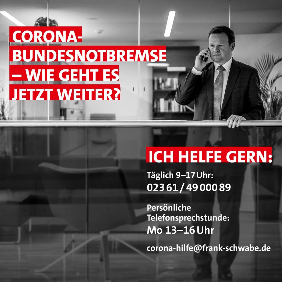 Ihre Anliegen können Sie auch per Mail an corona-hilfe@frank-schwabe.de an uns richten. Wir beantworten Ihre Fragen so schnell wie möglich.