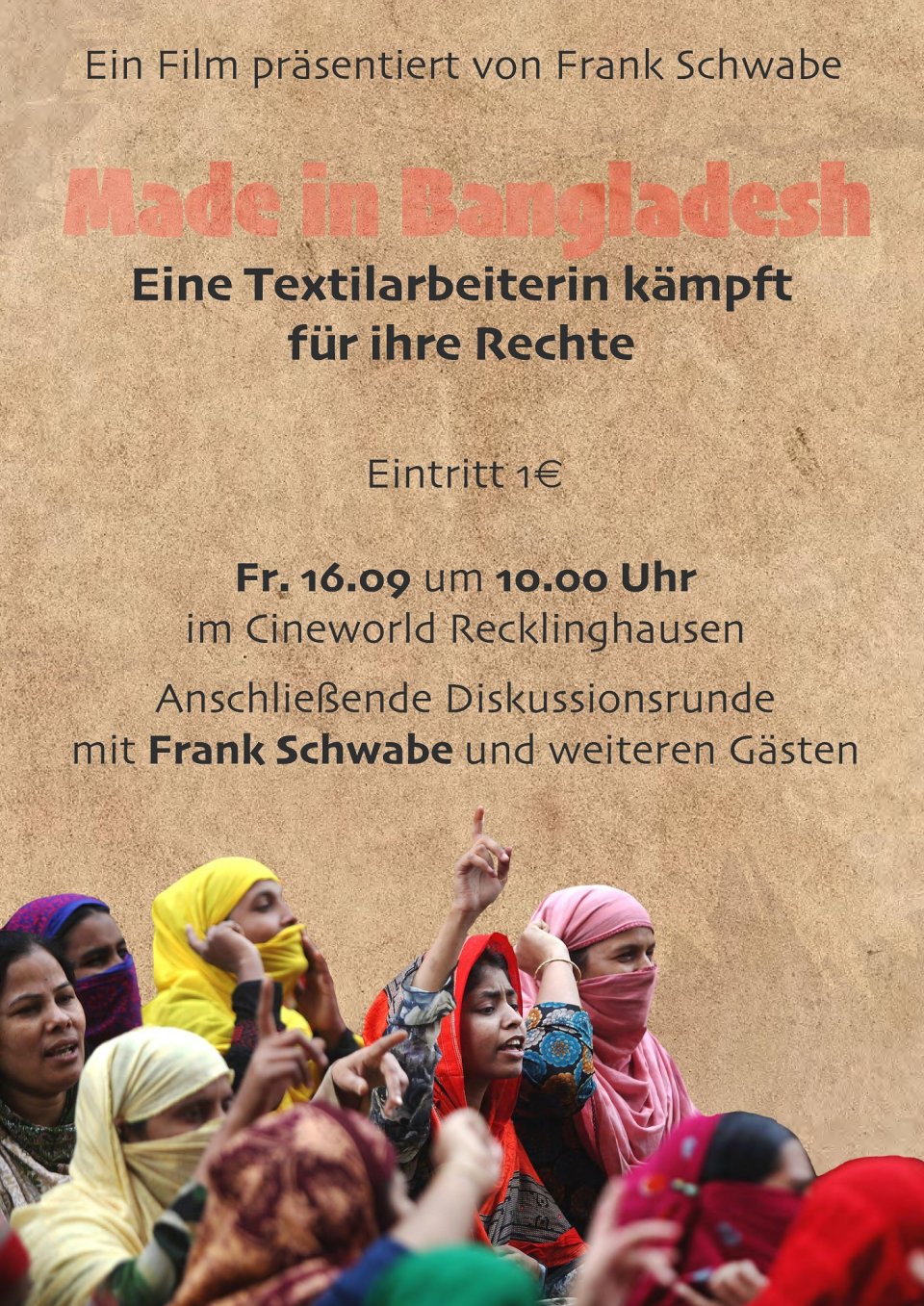 Für den 16. September lädt der Bundestagsabgeordnete Frank Schwabe im Rahmen der Fairen Woche in das Cineworld-Kinocenter an der Kemnastraße in Recklinghausen ein. Gezeigt wird der Film „Made in Bangladesh“ der Regisseurin Rubaiyat Hossain.