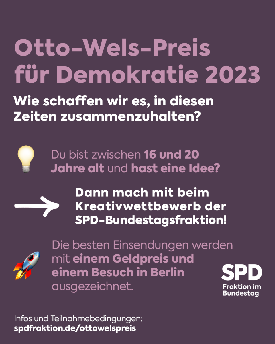 Mit dem Otto-Wels-Preis für Demokratie zeichnet die SPD-Bundestagsfraktion bereits zum 8. Mal junge Menschen mit kreativen Ideen aus. Wer teilnimmt kann zwischen zwei verschiedenen Aufgabenstellungen und unterschiedlichen Darstellungsformen – von einer Rede über Fotografien bis hin zu Videos oder Essays – auswählen. Der Preis soll einen Beitrag dazu leisten, dass sich junge Menschen mit Erinnerungskultur und einem friedlichen Zusammenleben in Europa beschäftigen.