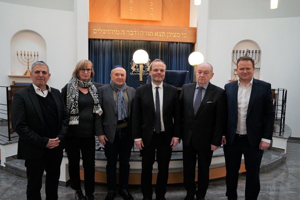 Zunächst stand ein Besuch bei der Jüdischen Kultusgemeinde in Recklinghausen auf dem Programm. Dort trafen Schwabe und Klein den Vorsitzenden Dr. Mark Gutkin und Kantor Isaac Tourgman. Bei dem Austausch, an dem auch Jochen Welt und Vera Klocke-Eickmann für den Freundeskreis der Jüdischen Gemeinde teilnahmen, ging es um die Frage, wie insbesondere junge Menschen sensibilisiert werden können, um sich gegen Antisemitismus zu engagieren.