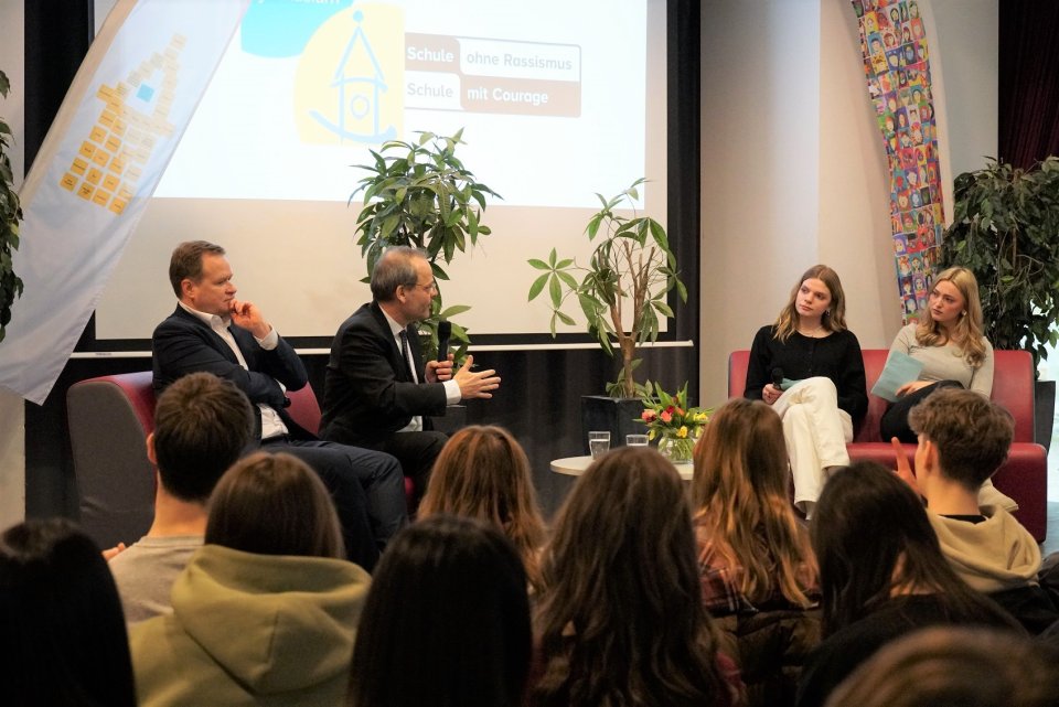 Nach dem Austausch ging es weiter zum Hittorf Gymnasium. Dort wurden die Gäste von Schulleiter Dr. Michael Jentsch und Mitgliedern des Kollegiums empfangen. Zunächst stellten zwei ehemalige Hittorf-Schülerinnen das Argumented Reality-Projekt „Jüdisches Leben entdecken“ vor. Im Rahmen eines virtuellen Rundgangs erinnert das Projekt an jüdisches Leben in Recklinghausen, wie es vor der Flucht und der Deportation der jüdischen Bevölkerung bestand. Im Anschluss ging es weiter mit einer moderierten Gesprächsrunde, an der mehr als 100 Schülerinnen und Schülern teilnahmen. Mit den Gästen wurde unter anderem die Frage erörtert, ob die AfD verboten werden soll und welchen Einfluss der Krieg in Nahost auf den Antisemitismus hat.