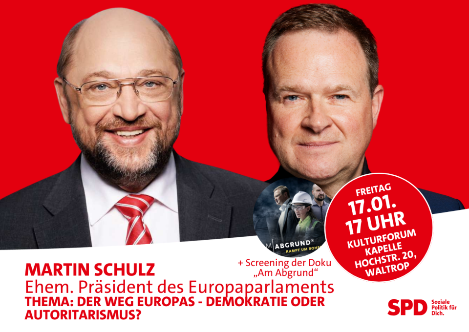 Im Anschluss an die Doku wird Martin Schulz über die Frage sprechen, wohin sich Europa, vor dem Hintergrund des Erstarkens rechter Parteien und der Einflussnahme von Populisten, entwickelt. Anschließend ist ein Austausch mit dem Publikum geplant.