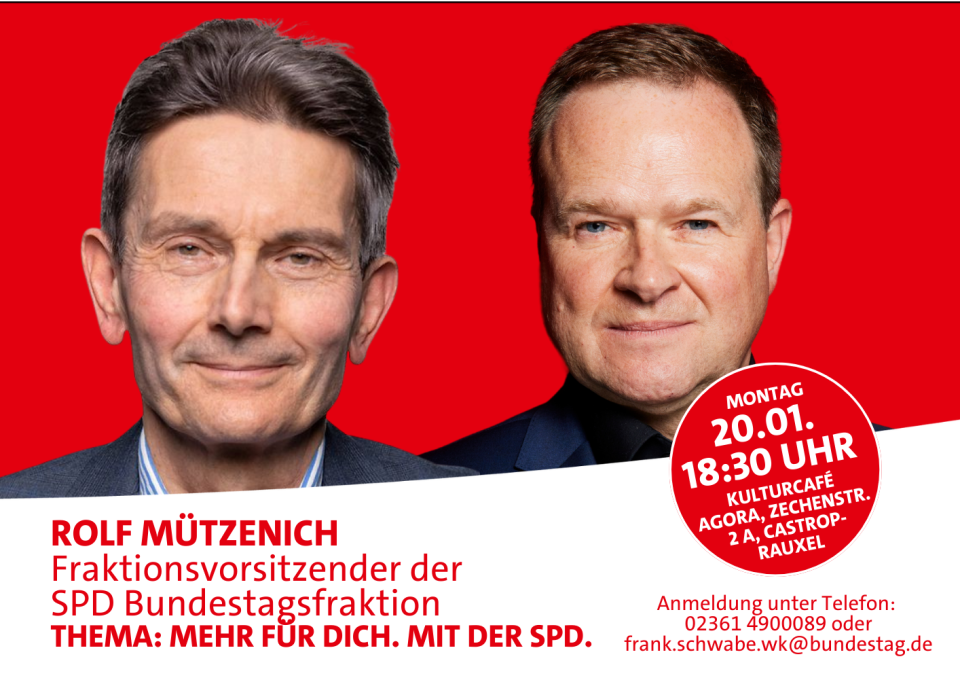 Am Montag, den 20. Januar kommt dann Dr. Rolf Mützenich, Vorsitzender der SPD-Bundestagsfraktion, nach Castrop-Rauxel. Ab 18:30 Uhr stehen im Kulturzentrum AGORA die Bundestagswahl und die Kernpunkte des sozialdemokratischen Wahlprogramms im Mittelpunkt. Die SPD setzt Schwerpunkte auf die Entlastung von Familien und Beschäftigten, auf ein stabiles Rentenniveau und auf Wirtschaftswachstum und die Sicherung von Arbeitsplätzen.
