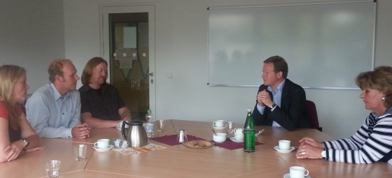 Anlässlich eines Besuches an der Käthe Kollwitz Gesamtschule in Recklinghausen fordert der heimische Bundestagsabgeordnete Frank Schwabe die Fortführung und den Ausbau des Programms zur Schulsozialarbeit. In einem Gespräch mit der Schulleiterin und den Sozialpädagogen informierte sich Frank Schwabe über die aktuelle Situation an der Gesamtschule in der Recklinghäuser Südstadt. Einer der Stellen wird seit Anfang 2012 aus Bundesmitteln der sogenannten B.u.T. (Bildungs- und Teilhabepaket) finanziert. Da die jetzige schwarz-gelbe Bundesregierung ein Auslaufen des Programmes beschlossen hat, droht die Stelle im Laufe des nächsten Jahres auszulaufen.